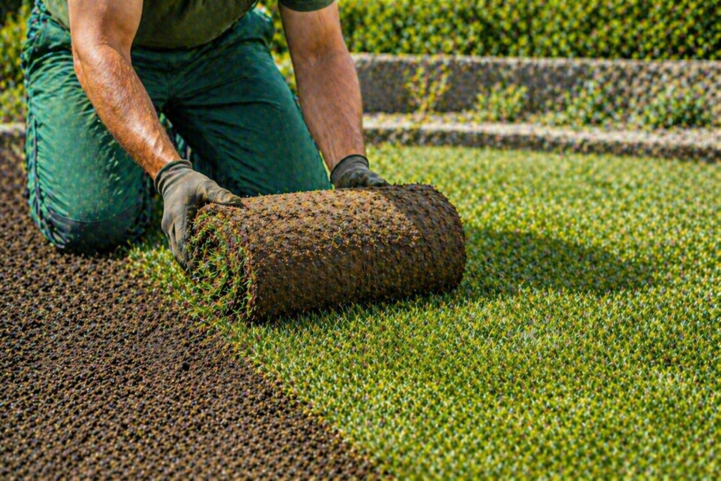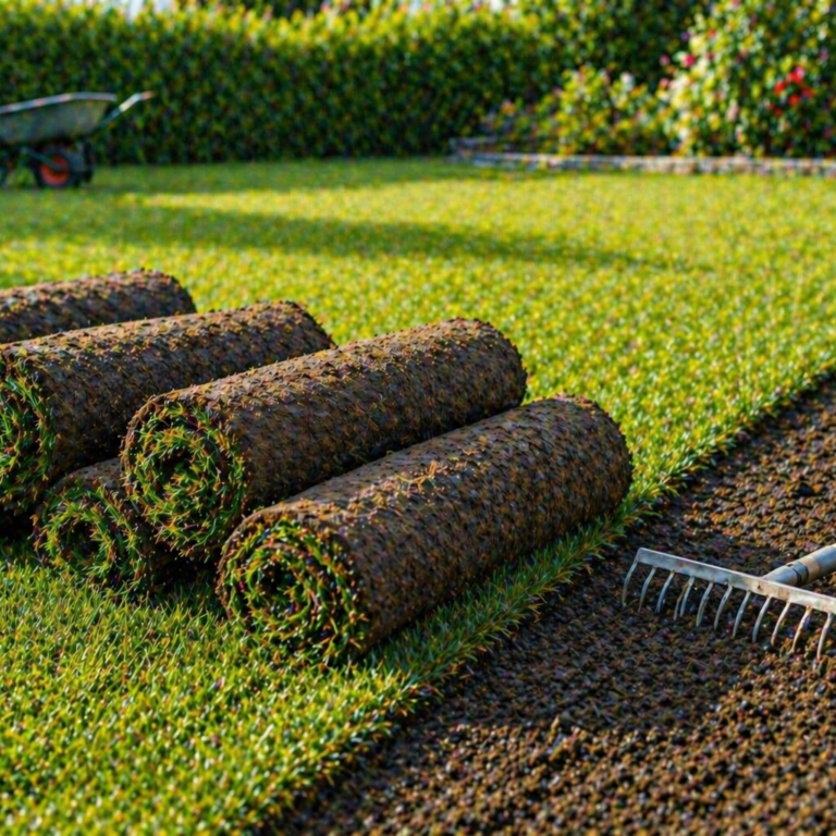 ✔ Préparation du sol (désherbage, nivellement) ✔ Amendement et fertilisation du terrain ✔ Pose des rouleaux de gazon ✔ Arrosage abondant après installation ✔ Roulage pour assurer l’enracinement